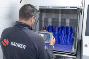The C1 Max is based on the C1 concept and was specifically adapted by AM Solutions – 3D post processing technology to meet the needs of Sauber Motorsport for using large build platforms. SLA-printed parts are immersed in the treatment tank using an automatically lowering build plate and are surrounded by a specially temperature- controlled process fluid. A propeller, working in tandem with perfectly coordinated but individually controllable nozzles, ensures optimal flow around the parts and maximum flexibility. A mesh basket also ensures that no parts are lost or damaged in the immersion tank. The perfectly coordinated interaction of chemical, thermal, and mechanical processes softens the support structures, allowing them to be easily and gently removed. In the past, each part had to be laboriously processed by hand with a spatula, requiring extended PPE equipment. “This saves us a lot of time. We used to need an entire day to post process the output of our seven machines. Now, half a day is enough,”explains Sousa. ” Scrap is also minimized, and the surface quality is significantly higher, requiring much less effort in further post processing.”