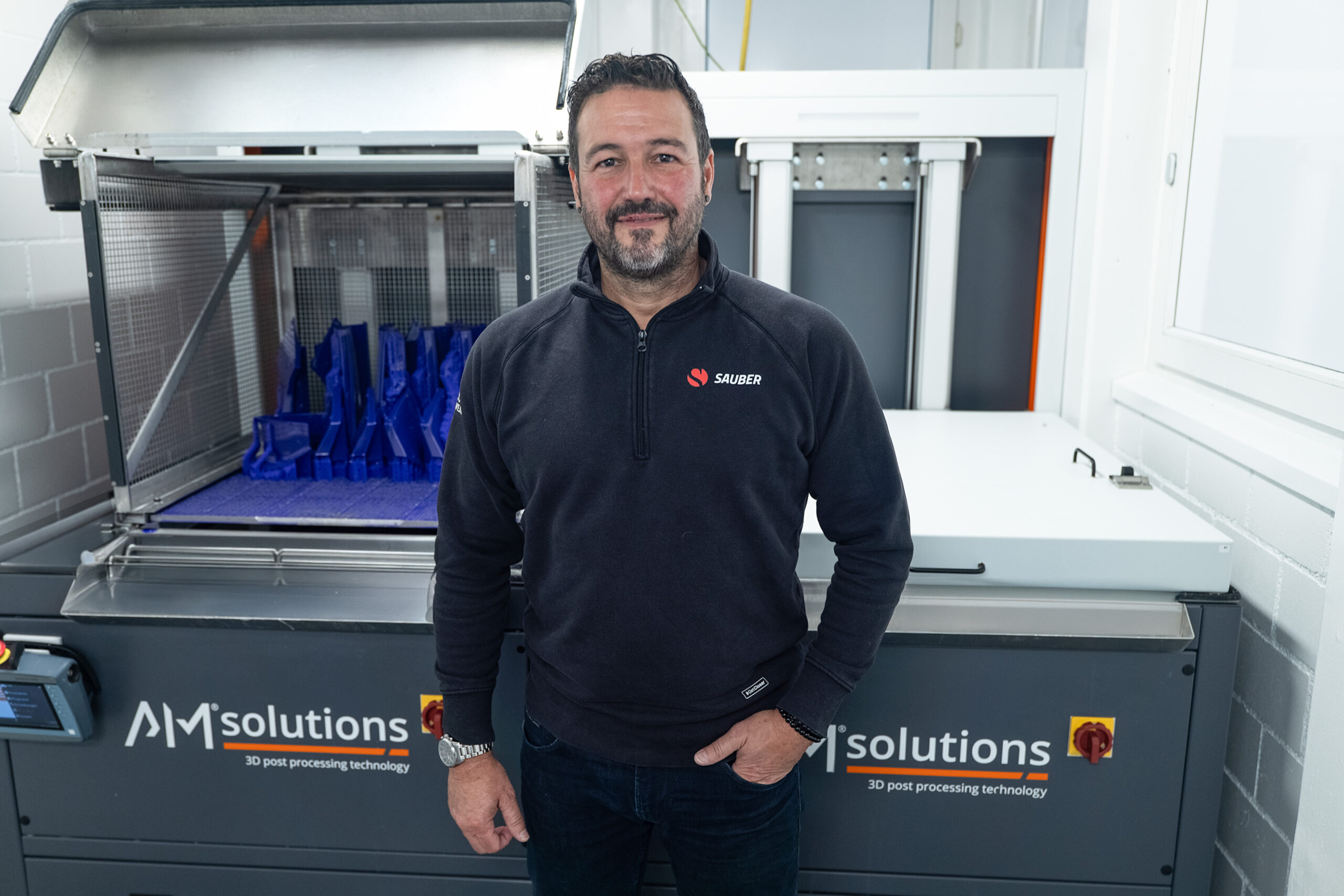 The parts that Sauber Motorsport produces with SLA printing are highly complex and require maximum precision. This is evident from their application, as they are almost exclusively used in the wind tunnel for Formula 1 and are crucial for a vehicle’s aerodynamics. To consistently and quickly deliver high-quality 3D printed parts – approximately 1,000 parts per week between October and February – efficient post- processing is essential. “In the past, we had to manually perform many steps in the chemical post processing of SLA parts,”explains Vitor Sousa, Head of AM Plastic & CNC for AM at Sauber Motorsport.”This not only took a lot of time, especially with seven printers, but it was also a significant strain on the staff working with the solvents. Since February, we have been using two C1 Max machines from AM Solutions and are extremely satisfied.”